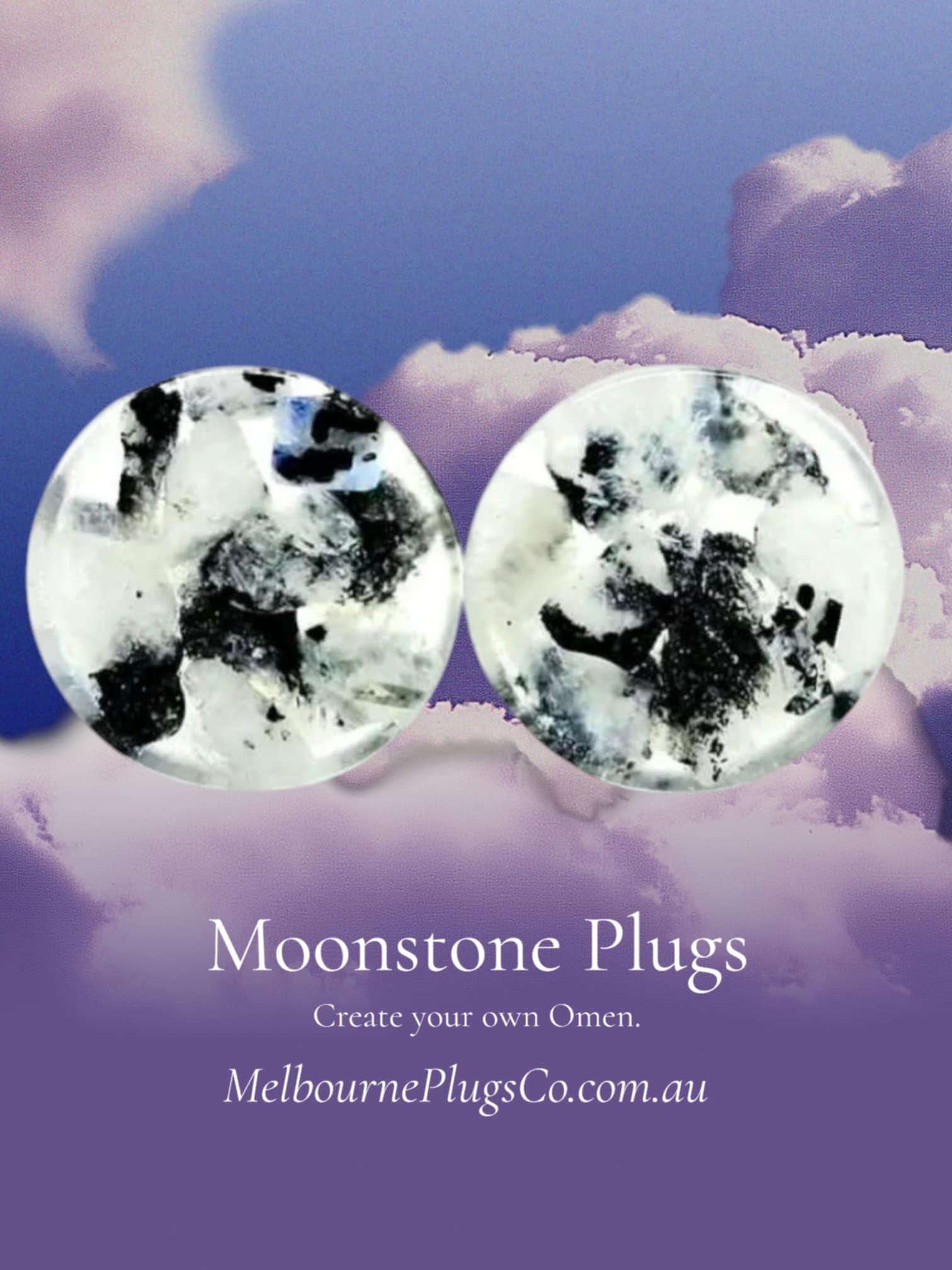 Moonstone, Used for centuries as a guide through uncertainty, a protector in the dark, and a key to unlocking hidden truths. These plugs are more than just jewellery, they are an omen of your own making, a whisper of the cosmos waiting to be worn.